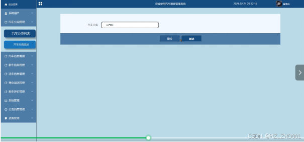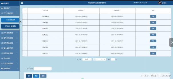 在后台的“汽车分类管理”页面可查看所有的汽车分类信息,包括汽车分类、创建时间和更新时间。还可以添加新的汽车分类列表。还可以进行查询、重置和删除等操作。界面如下图所示。