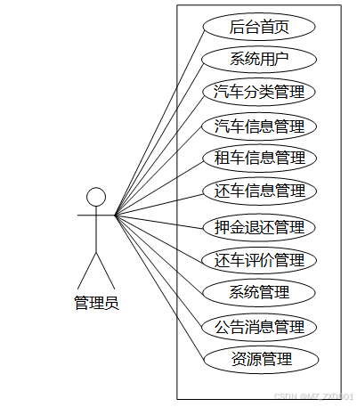 汽车租赁管理系统中管理员角色功能包含了后台首页、系统用户、汽车分类管理、汽车信息管理、租车信息管理、还车信息管理、押金退还管理、还车评价管理、系统管理(轮播图管理)、公告消息管理、资源管理(汽车资讯、资讯分类)等功能,管理员的用例图如图2.3所示: