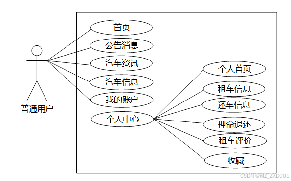 汽车租赁管理系统中普通用户角色功能包含了首页、公告消息、汽车资讯、汽车信息、我的账户、个人中心(个人首页、租车信息、还车信息、押命退还、租车评价、收藏)等功能,普通用户的用例图如图2.2所示: