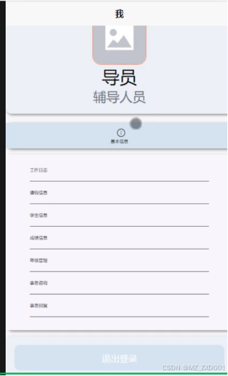 - 我的:用户点击首页右下角“我的”进入页面可以查看和管理基本信息、工作日志、请假信息、学生信息、年级管理、成绩信息、事务咨询、事务回复和收藏信息。点击“退出登录”即可退出系统登录。