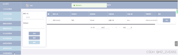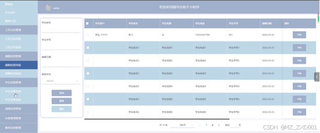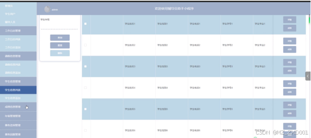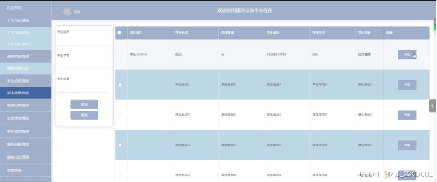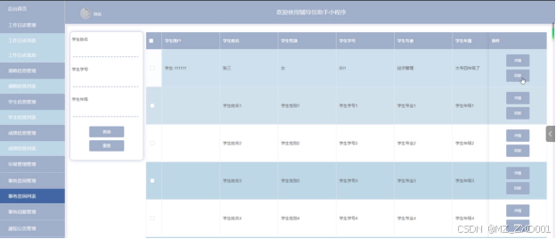 - 学生信息管理:用户可以查看学生信息列表中某个学生信息的详情,可以对学生信息进行查询和重置操作。