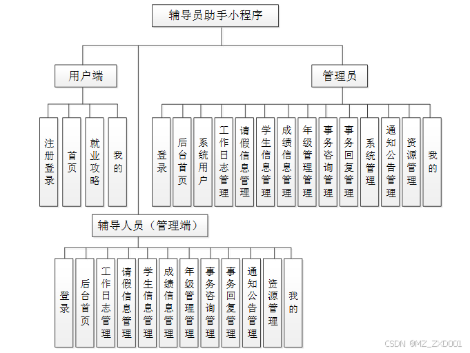 按照辅导员助手小程序的功能模块,主要包括用户端(学生用户、辅导人员)和管理端(辅导人员、管理员)这两大功能模块。