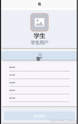 - 我的:用户点击首页右下角“我的”进入页面可以查看和管理基本信息、请假信息、学生信息、成绩信息、事务咨询、事务回复和收藏信息;点击“退出登录”即可退出系统登录。