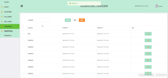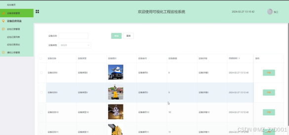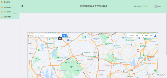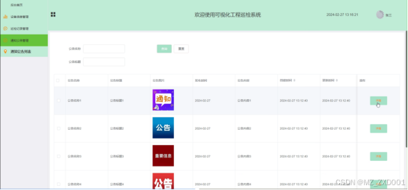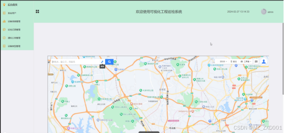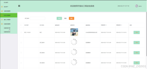管理员登录进入可视化工程巡检系统可以查看首页、系统用户管理(管理员、员工用户)、设备信息管理、巡检记录管理、通知公告管理、设备类型管理等信息,如图4-8所示。