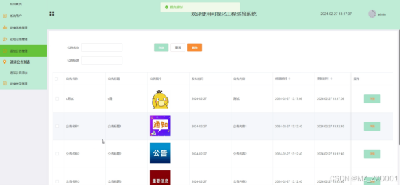 本论坛网站有管理员和员工用户两个角色。管理员功能有后台首页、系统用户管理、设备信息管理、巡检记录管理、通知公告管理、设备类型管理等。员工用户功能有后台首页、设备信息管理、巡检记录管理、通知公告管理等。因而具有一定的实用性。
