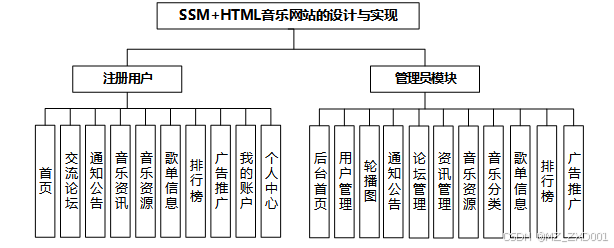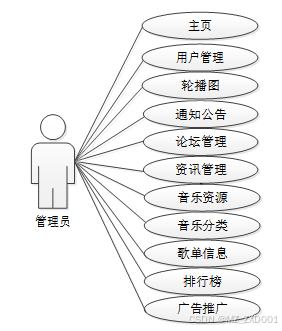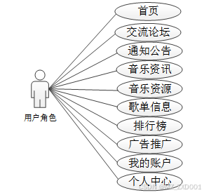 该音乐网站为普通用户提供了首页、交流论坛、通知公告、音乐资讯、音乐资源、歌单信息、排行榜、广告推广、我的账户、个人中心等功能。管理员则可通过后台首页管理主页、公共管理(轮播图、通知公告)、用户管理(管理员、注册用户)、论坛管理(论坛列表、论坛分类)、资讯管理(资讯列表、资讯分类)、音乐分类、音乐资源、歌单信息、排行榜、广告推广等内容。这些功能丰富了系统的音乐推荐和管理能力,满足了用户和管理员在音乐系统中的不同需求。具体功能需求分析如下: