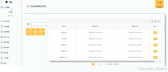 - 资讯管理(资讯列表、资讯分类):发布、编辑和删除音乐资讯,管理资讯分类。
