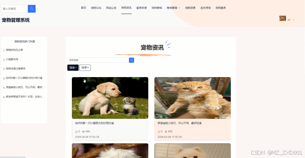 宠物信息:展示了系统中登记的各类宠物信息,包括品种、年龄、性别、健康状况等。用户可以浏览宠物信息,了解宠物的特点和养护需求,为领养或购买宠物提供参考。