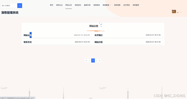 当进入基于springboot的宠物管理系统的时候,首先映入眼帘的是系统的导航栏,其主界面展示如下图4-1所示。