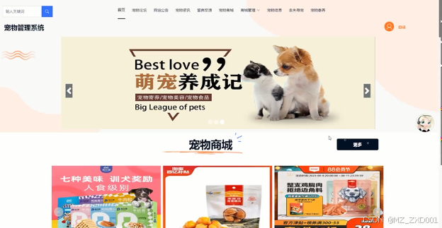首页:展示网站的基本信息和主要内容,包括留言反馈、宠物商城、商城管理 、宠物信息、走失寻宠、宠物寄养等。