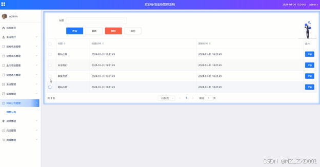 当用户点击“网站公告”后,可以查看系统发布的所有网站公告信息,在详情页面可以进行查看等操作,页面如图4-3所示。