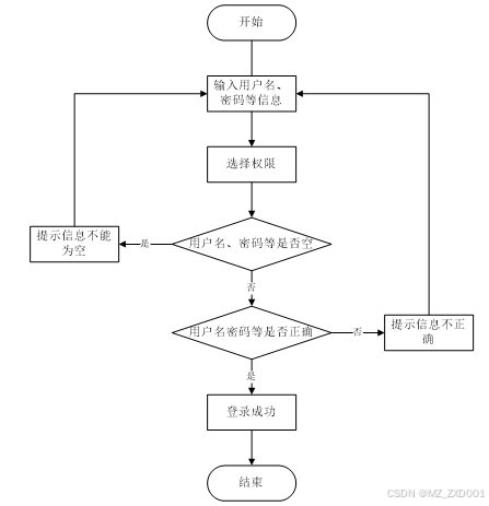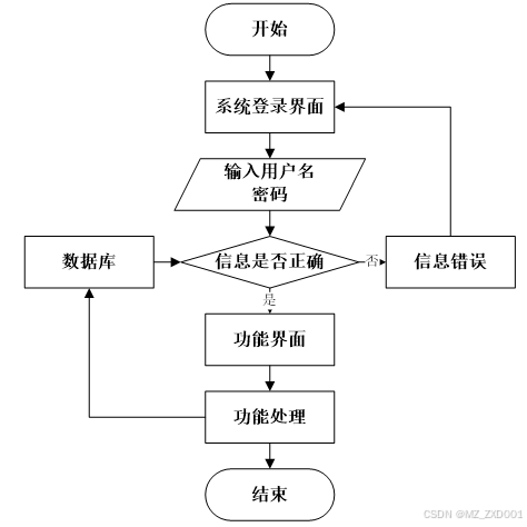 用户打开并进入系统后,会先显示登录界面,输入正确的用户名和密码,系统自动检测信息,若信息无误,则用户会进入系统功能界面,进行操作,否则会提示错误无法登录,操作流程如图2-3所示。