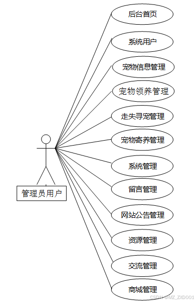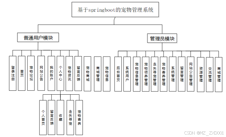 按照基于springboot的宠物管理系统的角色,系统划分为了普通用户模块和管理员模块这两大部分。