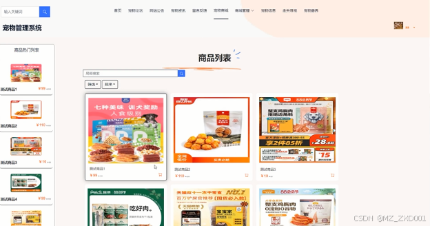 当用户在导航栏页面点击“宠物商城”,可以进行查看宠物商城,浏览商品列表。界面如下图所示。