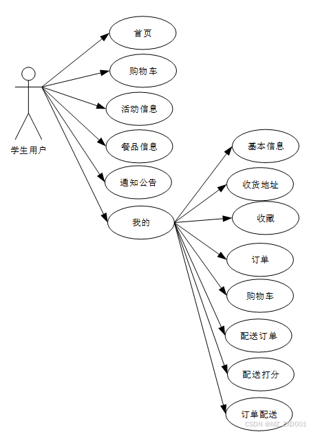 我的:学生用户可以查看和管理个人信息,包括基本信息、收货地址、收藏的餐品、订单历史、购物车状态、配送订单状态以及进行配送员的打分等操作。