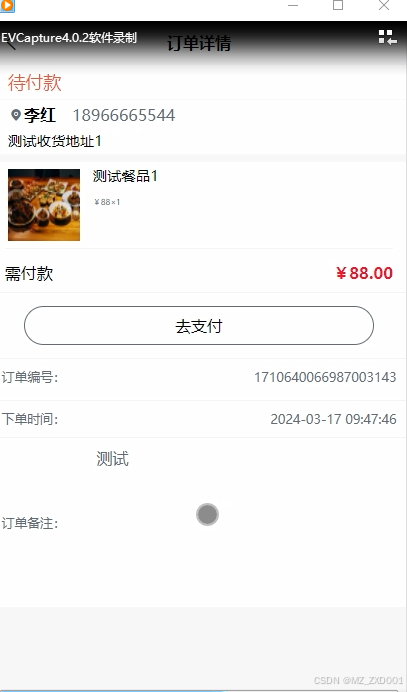 用户可以查看订单的详细信息,包括订单编号、下单时间、订单备注等,可以对订单进行支付。我的订单界面如下图所示。