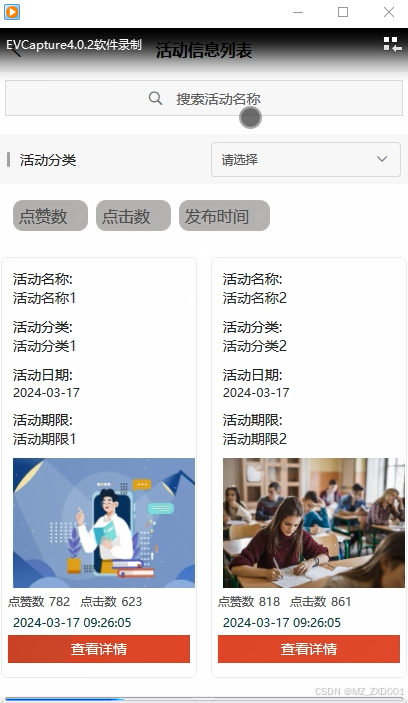 当用户点击“活动信息”这一菜单按钮,会显示管理员在后台发布的所有的活动信息,支持通过关键词对活动信息进行搜索,选择需要的活动信息点击可以进入到活动信息详细的介绍界面,同时可以进行点赞、评论等操作,活动信息界面如下图所示。