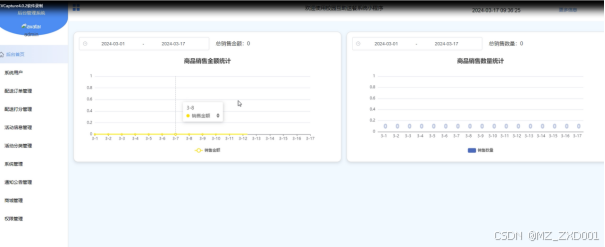 管理员可以查看后台首页、系统用户、配送订单管理、配送打分管理、活动信息管理、活动分类管理、系统管理、通知公告管理、商城管理、权限管理等,并且可以根据需要进行相应的操作,在功能界面还可以查看商品销售金额统计和商品销售数量统计。管理员功能界面如下图所示。