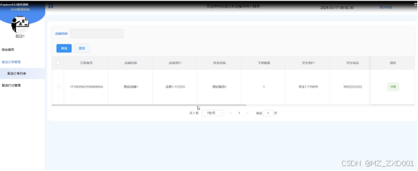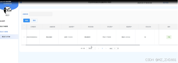 配送用户点击“配送订单管理”这个菜单,可以查看所有的配送订单信息,包括订单编号、店铺名称、店家用户、外卖名称、下单数量、学生用户、学生电话等信息,还可以进行查询和重置等操作。配送订单界面如下图所示。