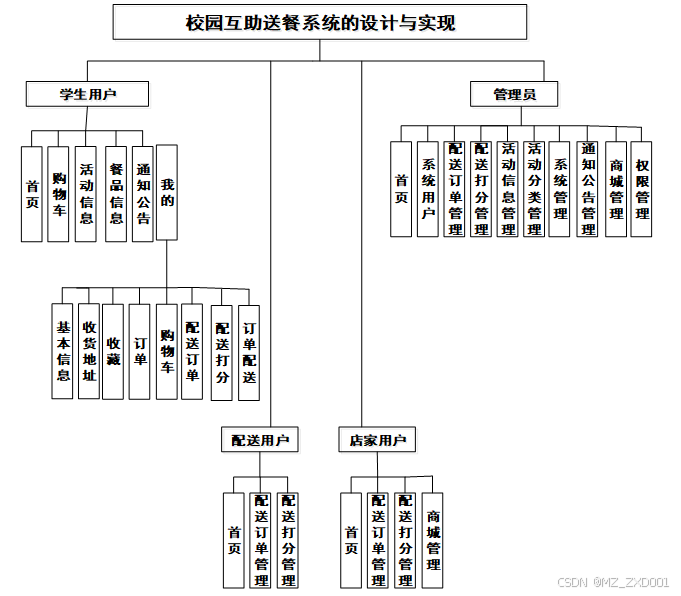 校园互助送餐系统的设计与实现分为四大部分:管理员、学生用户、配送用户、店家用户。