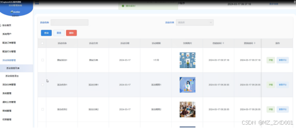 管理员点击“活动信息管理”这个菜单,可以查看活动信息列表和活动信息添加这两个子菜单,查看所有的活动信息,包括活动名称、活动分类、活动日期、活动期限、封面图片、创建时间、更新时间等信息。还可以添加新的活动信息。活动信息列表和活动信息添加如下图所示。