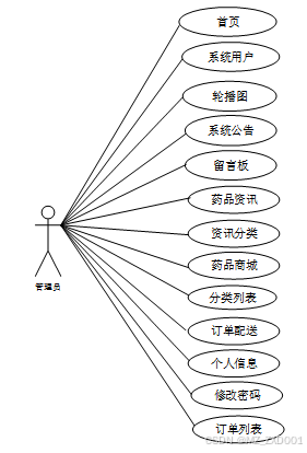 web后台管理上的管理员是维护整个药品商城网站中所有数据信息的。管理员角色用例如图2-4所示。