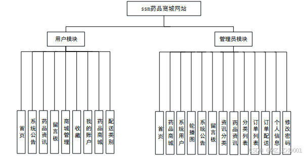 按照药品商城网站的角色,我划分为了系统用户模块、管理员管理模块这两大部分。