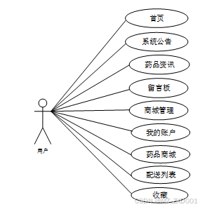 通过2.3功能的分析,得出了本药品商城网站的用例图:
