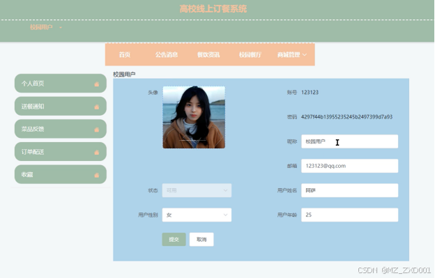 (1)用户注册登录:用户注册为用户并登录高校线上订餐系统;用户对个人中心的增删改查,比如个人资料,密码修改。