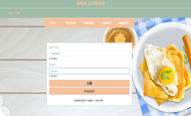 高校线上订餐系统中的前台上注册后的用户是可以通过自己的用户名、密码进行登录的,当用户输入完整的自己的用户名和密码信息并点击“登录”按钮后,将会首先验证输入的有没有空数据,再次验证输入的用户名+密码和数据库中当前保存的用户信息是否一致,只有在一致后将会登录成功并自动跳转到高校线上订餐系统的首页中;否则将会提示相应错误信息,用户登录界面如下图4-3所示。