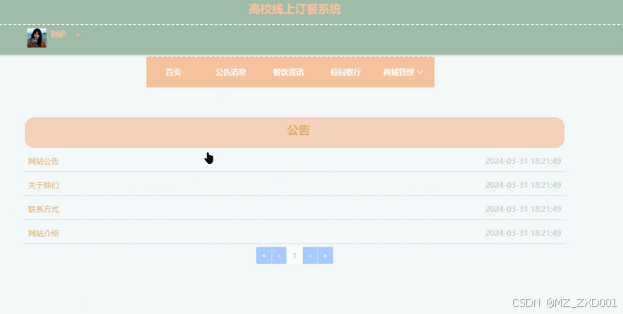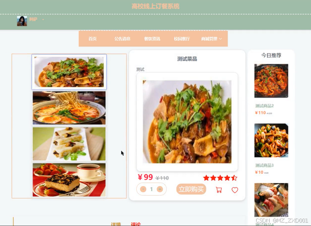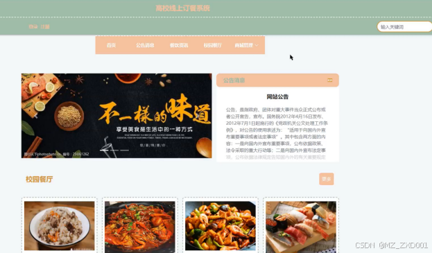 在高校线上订餐系统的前台首页界面上采用了上+中+下的方式来布局界面,左上角是登录+注册这两个链接,下面依次是导航栏+轮播图以及公告消息,下面依次是推荐的校园餐厅展示,其主界面展示如下图4-1所示。