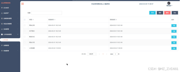 高校线上订餐系统中的管理人员在公告消息管理页面可以查看标题、创建时间等内容,并根据需求进行查询、重置、删除、添加等操作。公告消息界面如下图4-13所示。