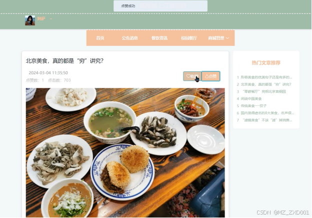 当用户点击“餐饮资讯”后可以查看所有的餐饮资讯标题、封面图等信息,可以了解到该资讯的具体内容,并进行点赞、收藏、评论等操作。餐饮资讯详细界面如下图4-5所示。