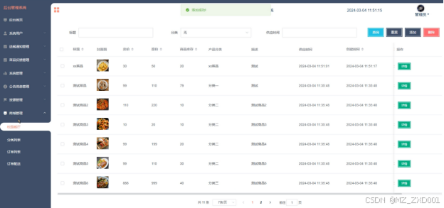 (7)商城管理:管理员可以对校园餐厅、分类列表、订单列表和订单配送等信息进行增删改查。