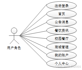 高校线上订餐系统的完整UML用例图分别是图2-1和图2-2。在参与者上包括用户以及管理员。前台上用户角色用例包括用户是注册登录、首页、公告消息、餐饮资讯、校园餐厅、商城管理、我的账户等,用户角色用例如图2-1所示。