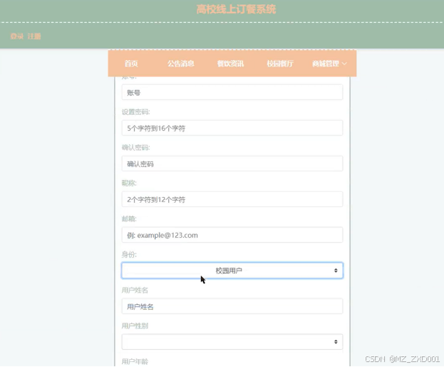 不是高校线上订餐系统中用户的是可以在线进行注册的,当填写上自己的账号、密码、昵称、邮箱、身份、用户姓名、用户性别、用户年龄等再点击“注册”按钮后将会先验证输入的有没有空数据,再次验证密码和确认密码是否是一样的,最后验证输入的账户名和数据库表中已经注册的账户名是否重复,只有都验证没问题后即可注册成功。其用注册界面展示如下图4-2所示。
