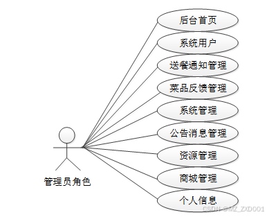 web后台管理上的管理员是维护整个高校线上订餐系统中所有数据信息的,管理员可以进行后台首页、系统用户、送餐通知管理、菜品反馈管理、系统管理、公告消息管理、资源管理、商城管理、个人信息等。管理员角色用例如图2-2所示。