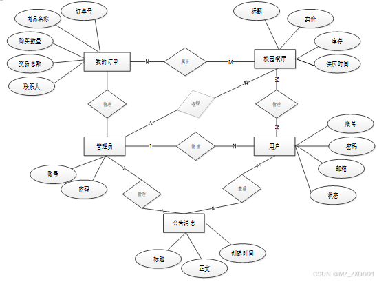 下面是整个高校线上订餐系统中主要的数据库表总E-R实体关系图。