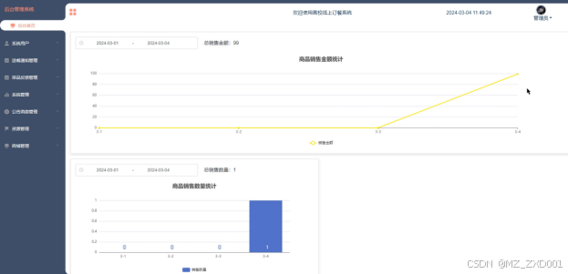 高校线上订餐系统中的后台首页可以查看商品销售金额统计图和商品销售数量统计图。后台首页界面如下图4-9所示。