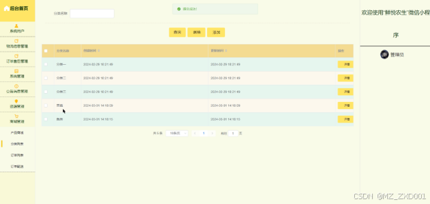 后台管理人员是可以对“鲜悦农生”微信小程序内的农产商品的类别进行管控。分类列表界面如下图5-17所示。