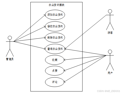 (2)农业资讯模块:管理员在后台可以对农业资讯及其分类进行增删改查,游客实现查看农业资讯,用户进行收藏、点赞、评论。如下图3-5所示。