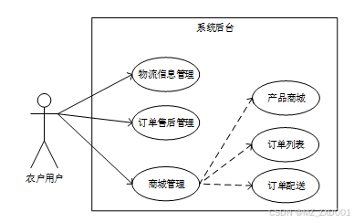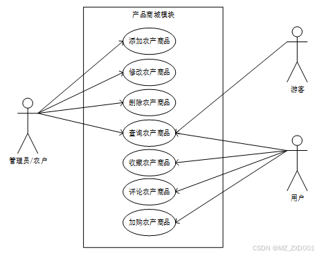 (1)产品商城模块:本“鲜悦农生”微信小程序最主要的功能就是购买农产品,所以系统中需要管理员添加各种农产品商品供用户查询,购买,管理员和农户用户在此模块主要是对农产品的增删改查,游客实现对农产品的查询,普通用户则实现农产品的收藏、评论、加购、立即购买等操作。如下图3-4所示。