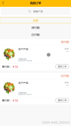 (5)我的订单管理:在“鲜悦农生”微信小程序中,用户、农户和管理员都能够管理订单,可以对订单进行查看、删除。如下图3-8所示。