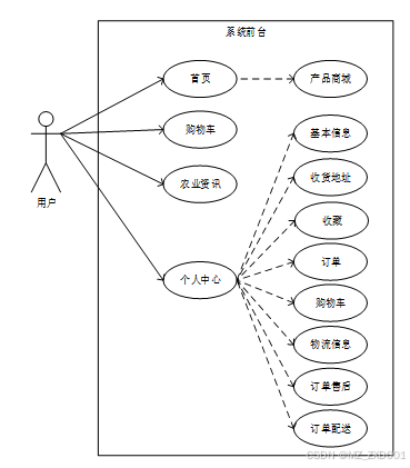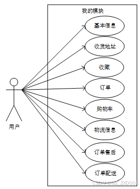 (6)我的模块:我的模块是用户独有的功能,可以在“我的”管理基本信息、收货地址、收藏、订单、购物车、物流信息、订单售后、订单配送,我的用例如下图3-9所示。