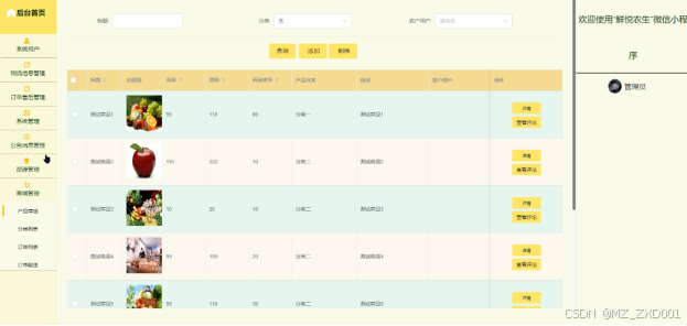 后台管理人员对“鲜悦农生”微信小程序内的不同产品商城的分类下的农产商品信息进行维护和管理的,产品商城管理界面如下图5-16所示。