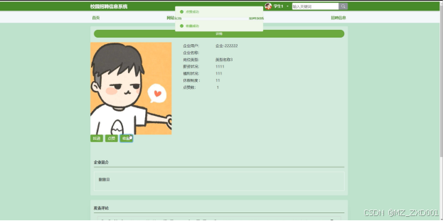 - 招聘资讯:学生用户可以通过招聘资讯板块查看详细的招聘信息,了解不同企业的热门岗位、薪资和福利状况。学生可以使用搜索功能,根据局部信息、筛选条件或排序方式快速找到心仪的岗位。对于感兴趣的资讯,学生可以点赞、收藏或发表评论,与其他求职者交流心得。