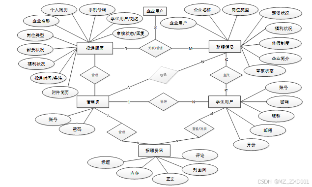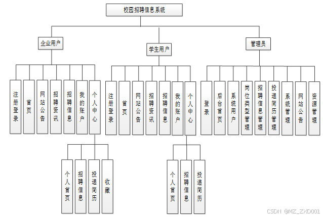 按照校园招聘信息系统的角色,我划分为了管理员、企业用户以及学生用户这三大部分。