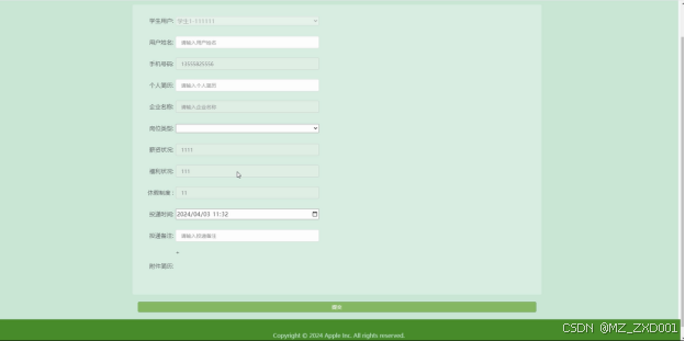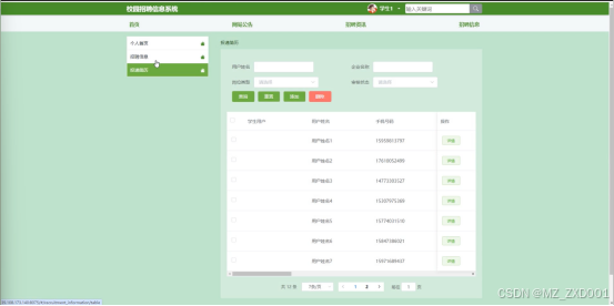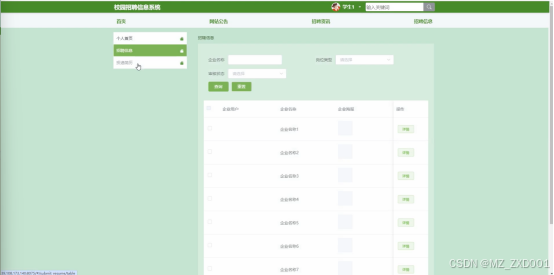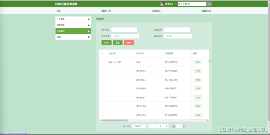 - 招聘信息:在个人中心的招聘信息管理页面,学生可以查看自己投递的所有简历及其状态,包括已投递、已查看、已回复等。学生可以通过企业名称、岗位类型或审核状态进行搜索,快速定位到特定的简历。对于需要重置或查看详情的简历,学生可以进行相应的操作。此外,学生还可以查看简历的审核状态,了解企业是否已经收到并处理了自己的申请。