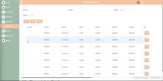 - 系统用户管理:管理员负责系统用户的账号审核工作,确保所有用户信息的真实性和合规性。同时,管理员可以对学生用户、企业用户等不同类型的用户进行增删改查和查看详情操作,管理用户资料,保障平台用户数据的质量和安全。