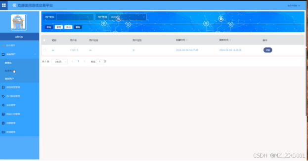 基于django的游戏交易平台中的管理人员是可以对注册的普通用户、商家用户进行管理的,也可以对管理员进行管控。界面如下图4-13所示。
